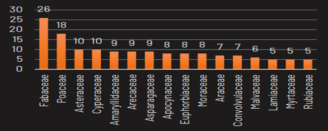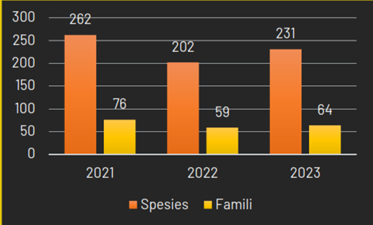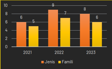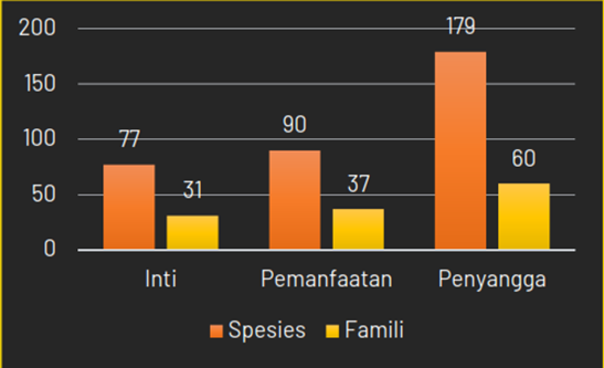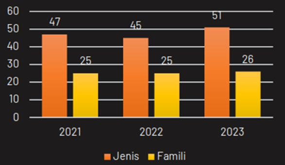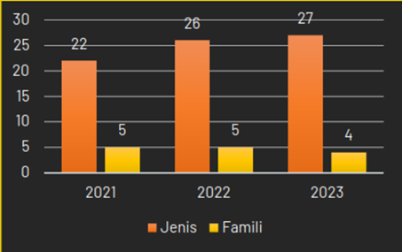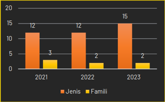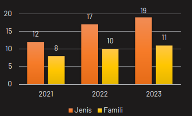 Berdasarkan hasil monitoring keanekaragaman hayati pada kajian flora di PT PLN Nusantara Power UP Indramayu ditemukan sebanyak 231 spesies tumbuhan dari 64 famili. Jumlah spesies dan famili yang ditemukan disajikan pada Gambar 15. Jumlah temuan jenis pada tahun 2023 mengalami kenaikan daripada tahun sebelumnya yaitu 202 spesies tumbuhan dari 59 famili. Pertambahan jumlah temuan jenis tumbuhan terdiri dari habitus pohon, semak, perdu, dan herba. Monitoring dilakukan pada 3 lokasi zona yaitu zona inti, zona pemanfaatan, dan zona penyangga dengan jumlah temuan jenis tumbuhan yang berbeda-beda di setiap zonanya. Kenaikan jumlah temuan jenis tumbuhan lebih banyak dari jenis non pohon terutama jenis tanaman hias. Kegiatan pengayaan yang dilakukan oleh pihak PT PLN Nusantara Power UP Indramayu mempengaruhi jumlah temuan jenis di tahun 2023.