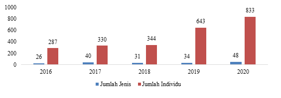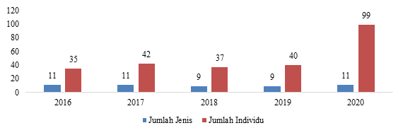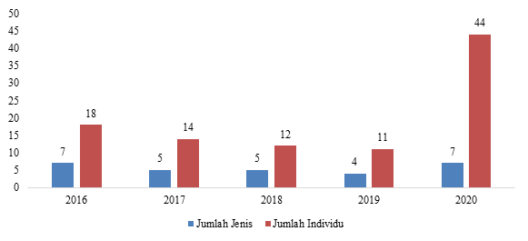 Gambar 47 Perbandingan jumlah jenis dan jumlah individu mamalia yang ditemukan di area perlindungan privat PT PJB UBJOM PLTU Indramayu berdasarkan survei tahun 2016 hingga tahun 2020
