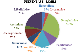 Hasil identifikasi jenis serangga di area perlindungan privat PT PJB UBJOM PLTU Indramayu yang paling banyak ditemukan adalah jenis serangga dari famili Libellulidae dan Nymphalidae. Presentase famili Nymphalidae memiliki nilai tertinggi yaitu 28% yang terdiri dari 9 spesies, kemudian famili Libellulidae 21% yang terdiri dari 7 spesies diikuti oleh Pieridae 15% terdiri dari 5 spesies, Papilionidae dan Coenagrionidae 9% terdiri dari tiga spesies, Saturniidae 6% dan 3% untuk famili Hesperiidae, Lycaenidae, Arctiidae dan Aeshnidae yang masing-masing terdiri dari satu spesies. Berikut grafik presentasi famili serangga yang ditemukan di area perlindungan privat PT PJB UBJOM PLTU Indramayu.